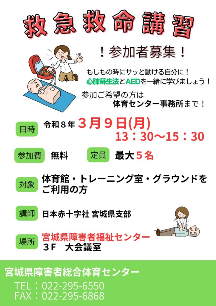 宮城県障害者総合体育センターでは、日本赤十字社宮城県支部を講師に迎え、心肺蘇生法とAEDの使用方法を学ぶ救急救命講習を開催します。